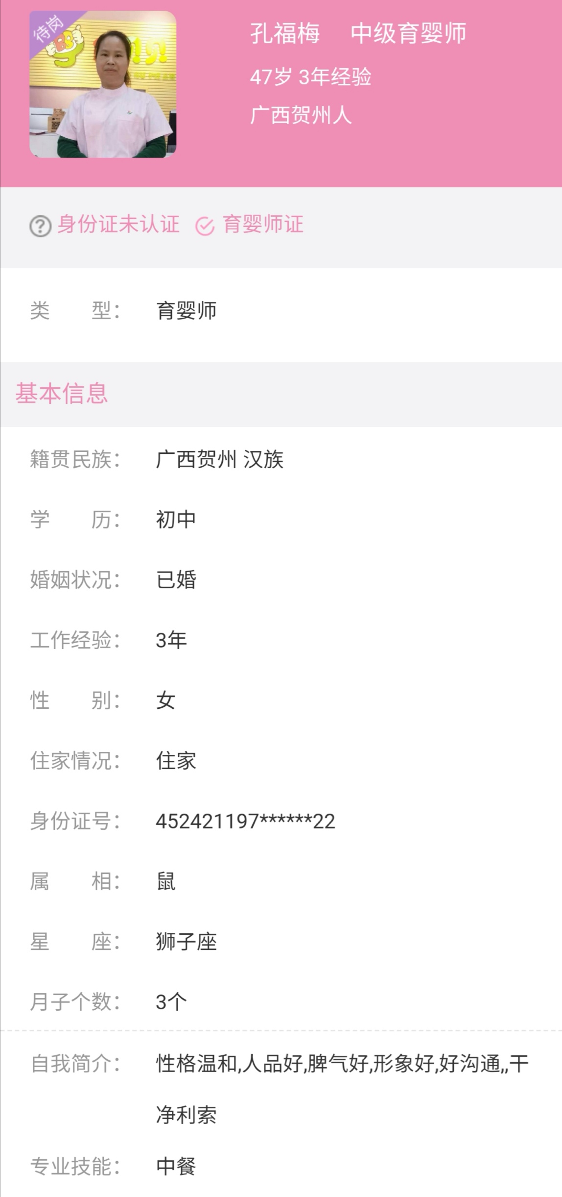 孔福梅·中级育婴师